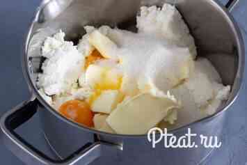 Поміщаємо в каструльку 400 г сиру жирністю не менше 9%, 80 г вершкового масла 82.5% кімнатної температури, 80 г цукру і 30 г жовтка (від двох яєць категорії 0).
