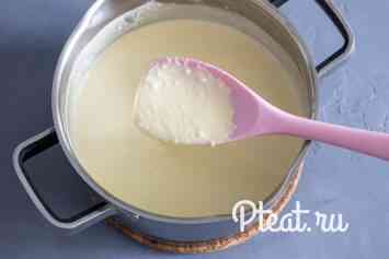 Ставимо на середній вогонь (не більше 6 на індукції) і, помішуючи, прогріваємо приблизно протягом п’яти хвилин, до появи перших «булькань». Ні в якому разі не кип’ятимо! знімаємо з вогню. Маса стане рідкою.