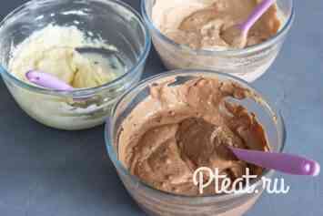 Розділимо їх також на три нерівні частини. Скажімо, 60, 40 і 20 р додаємо до сирно-шоколадним масам: найменшу — до маси з білим шоколадом, середню — до маси з молочним шоколадом, велику — до маси з темним шоколадом.