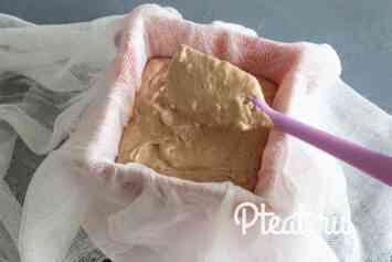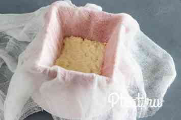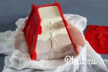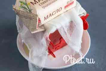 Тепер збираємо нашу форму-пасочницу, ставимо догори ногами на блюдо, вистилаємо всередині складеної вдвічі марлею. Намагаємося щоб було якомога менше складок.